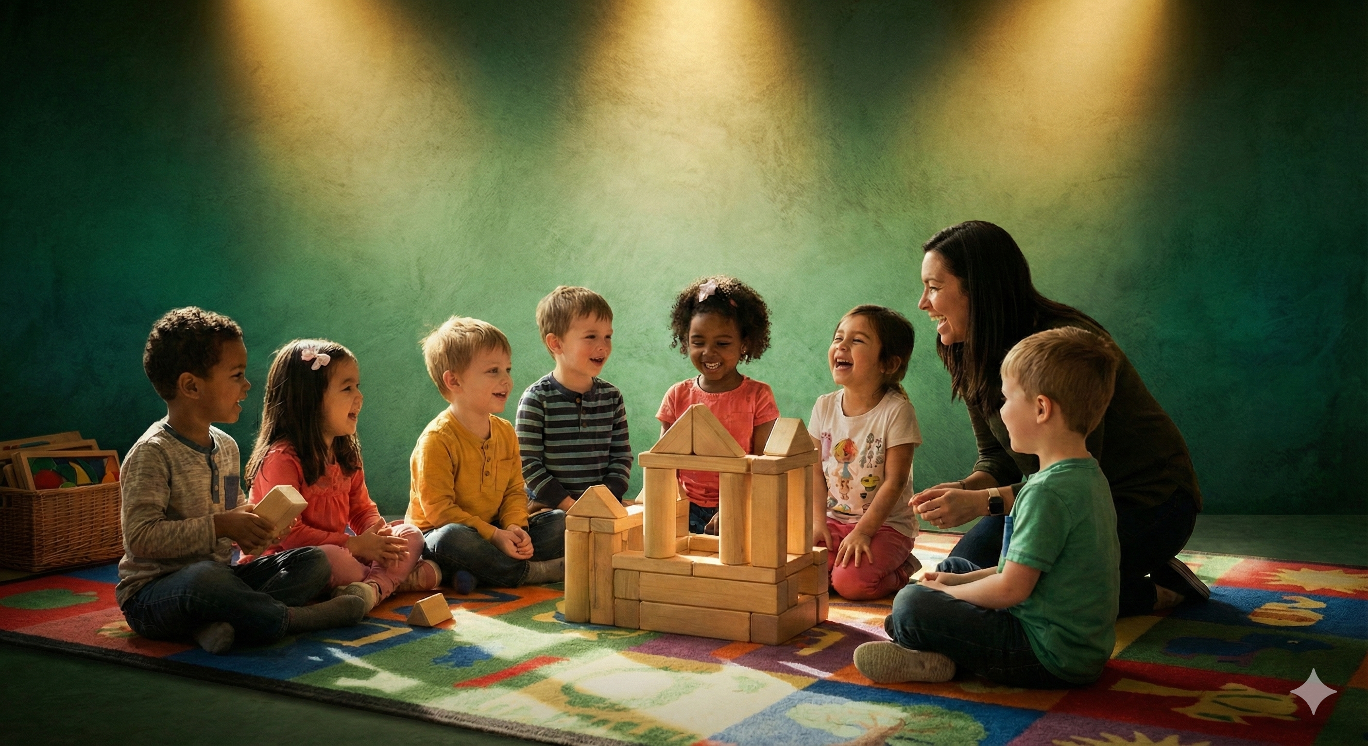 Bright, colorful classrooms filled with art supplies, building blocks, and engaging materials designed to spark imagination and self-expression.